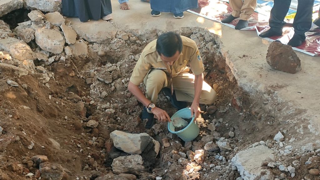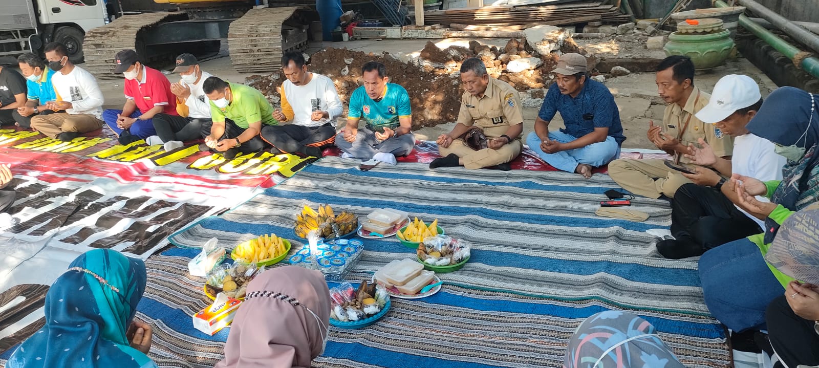 Demak – Senin 8/08/2022 Apel pagi telah usai, Kepala dinas pekerjaan umum dan penataan ruang Bapak Akhmad Sugiharto,ST., MT beserta struktural dan sub koordinator segera ke halaman kantor Dinputaru untuk melakukan peletakan batu pertama sebagai simbolis pembangunan musholla dan mengadakan selamatan supaya diberikan kelancaran dan kemudahan dalam proses pembangunannya.