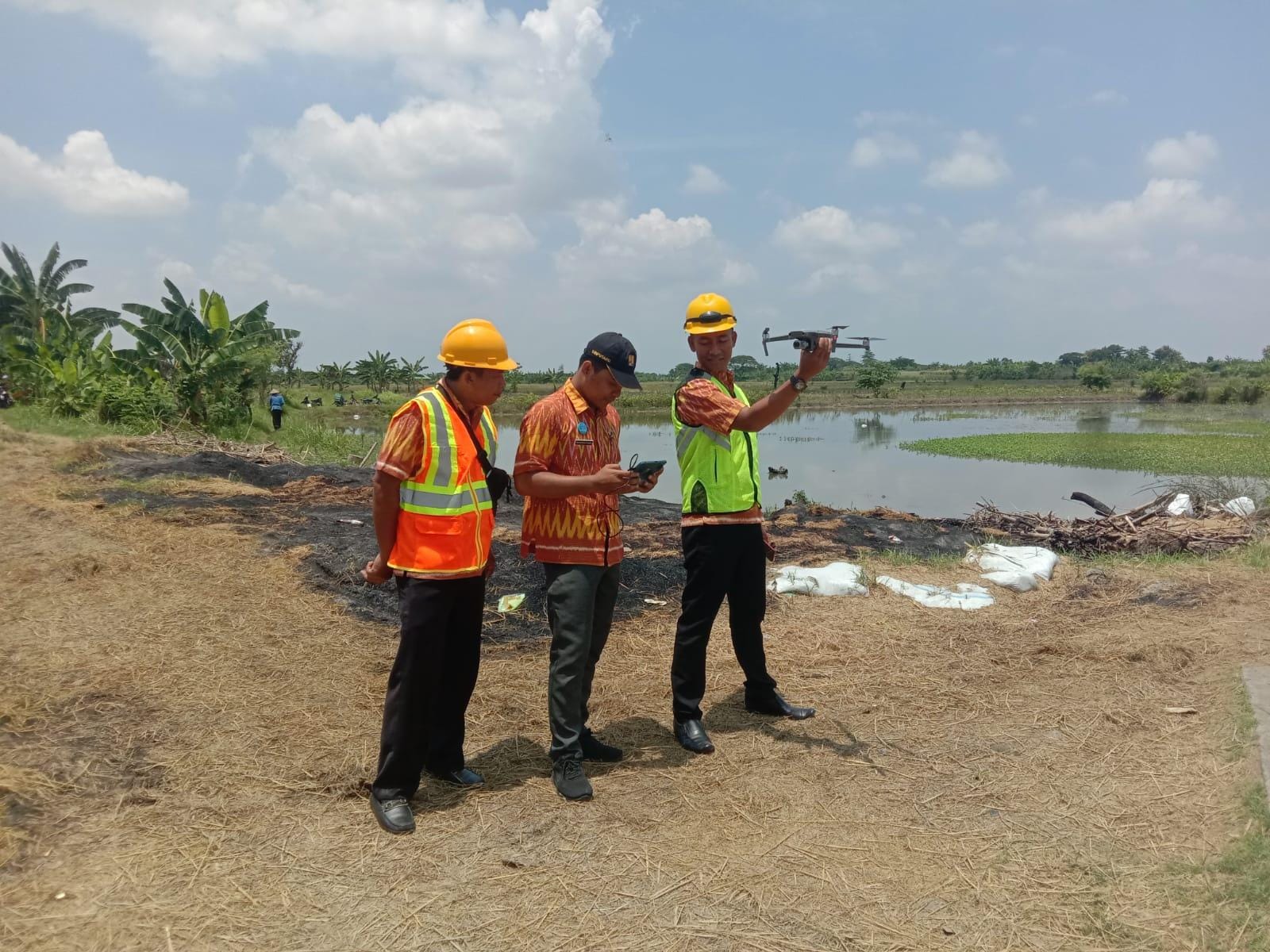 Monitoring dilakukan menggunakan video drone yang dioperasikan untuk menyisir seluruh area Bendung Wilalung dari segala arah, terutama pada pintu keluar-masuknya air.