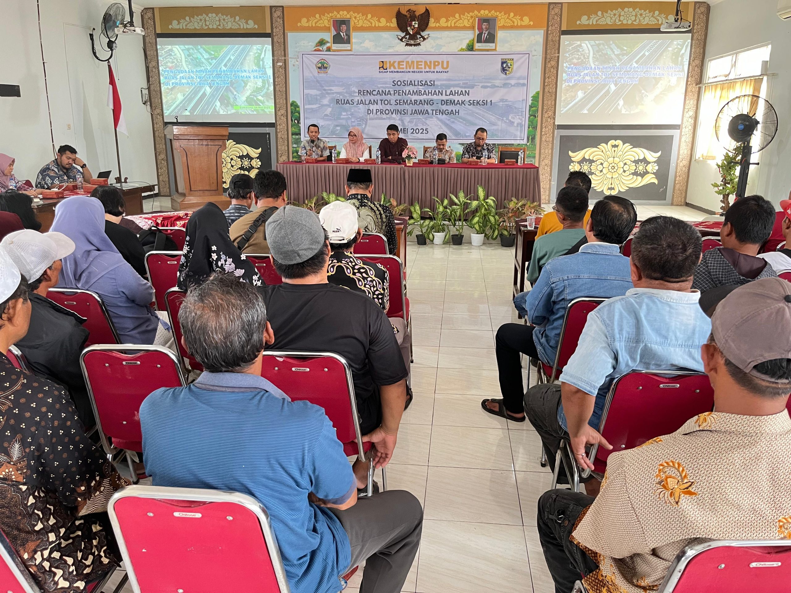 Dalam rangka pengadaan tanah untuk kepentingan umum, Dinas Pekerjaan Umum dan Penataan Ruang (DINPUTARU) Kabupaten Demak mengikuti Sosialisasi Rencana Pembangunan Persiapan Pengadaan Tanah Penambahan Lahan Ruas Jalan Tol Semarang – Demak Seksi 1 selama dua hari pada 15-16 Mei 2025.